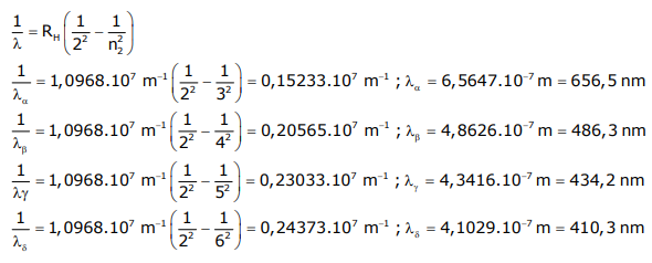 Se calculan a continuación las longitudes de las líneas correspondientes a la serie de Balmer para el hidrógeno.